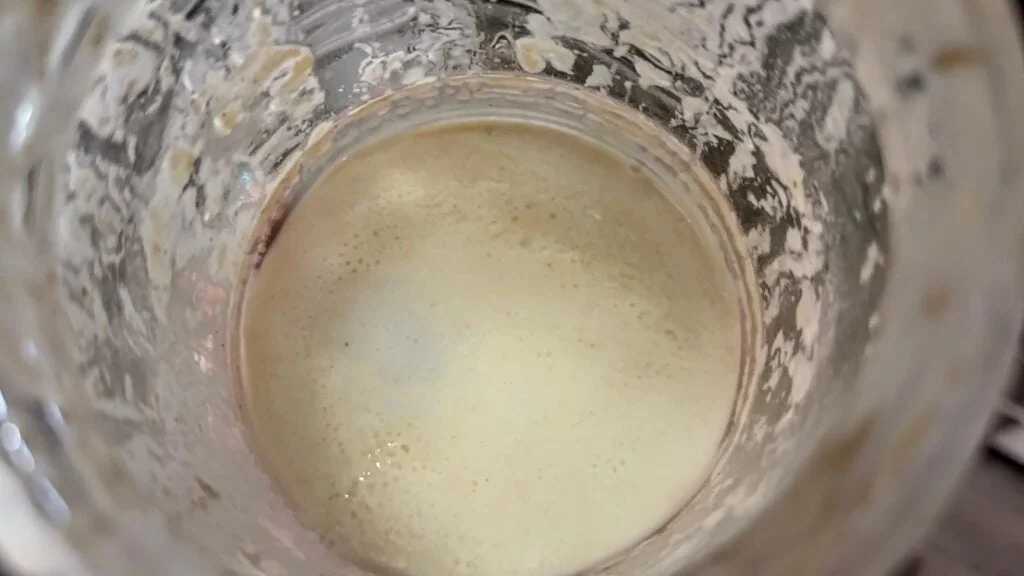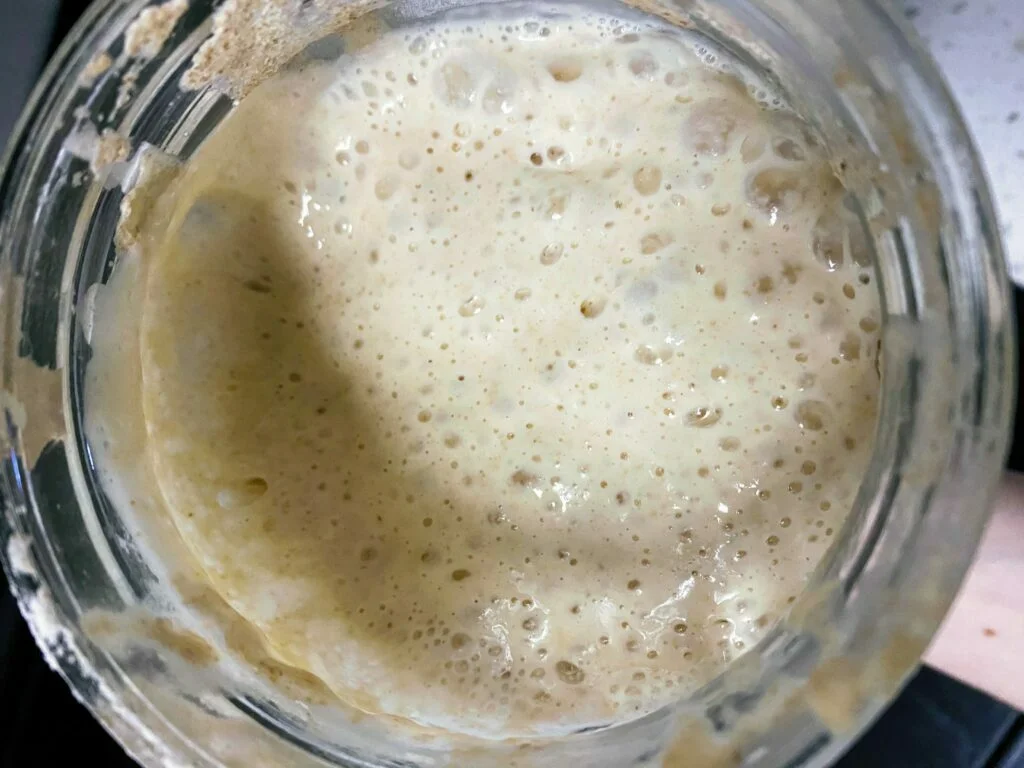 This is what my starter looked like right after feeding it – you can see 3 tiny bubbles.