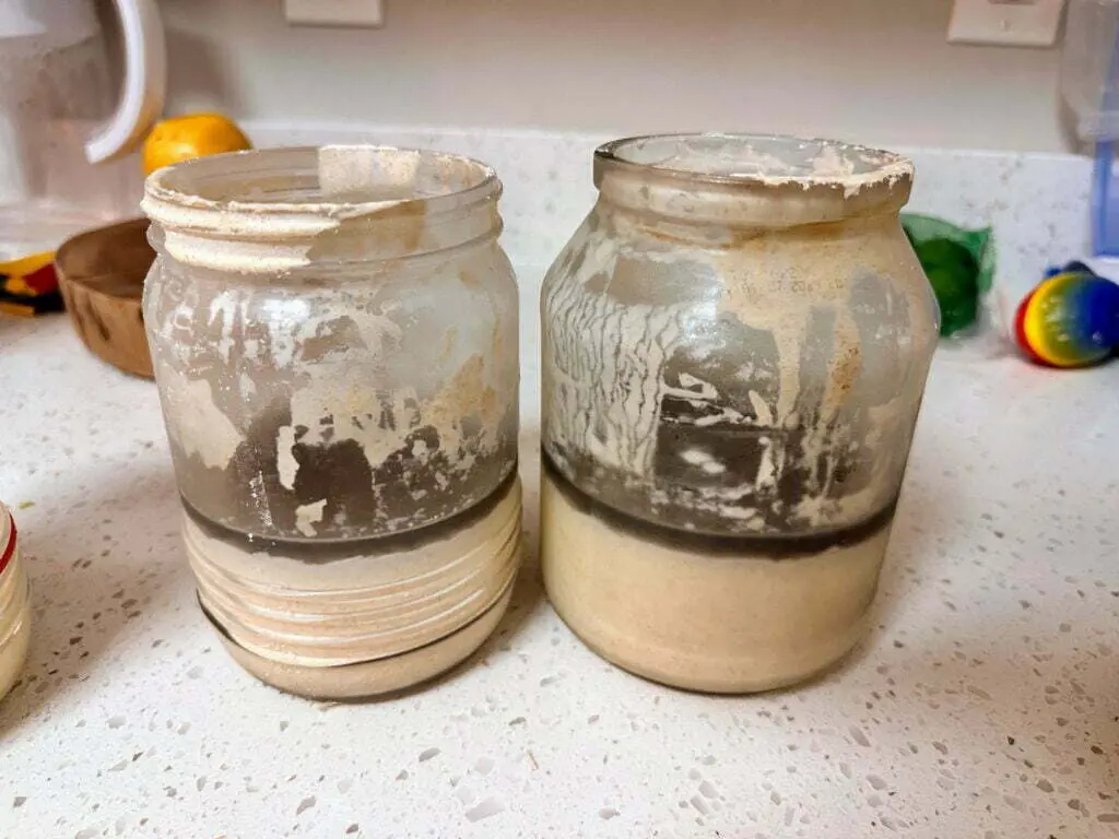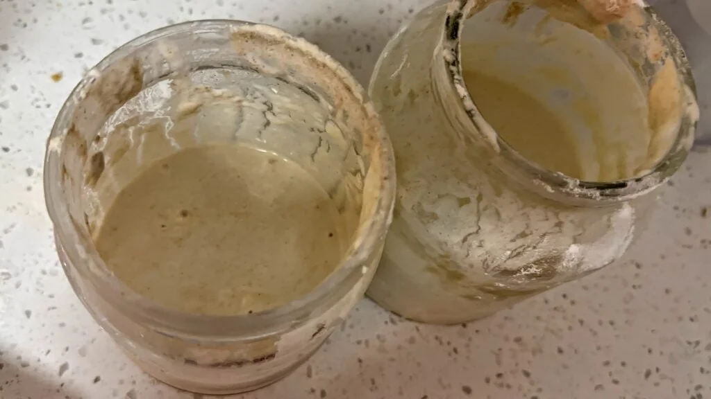 Even though sometimes you can mix in the liquid (“hooch”), in this extreme situation I decided to pour it out. Get rid of the liquid that is on top of your starter. Just dump it in a sink.